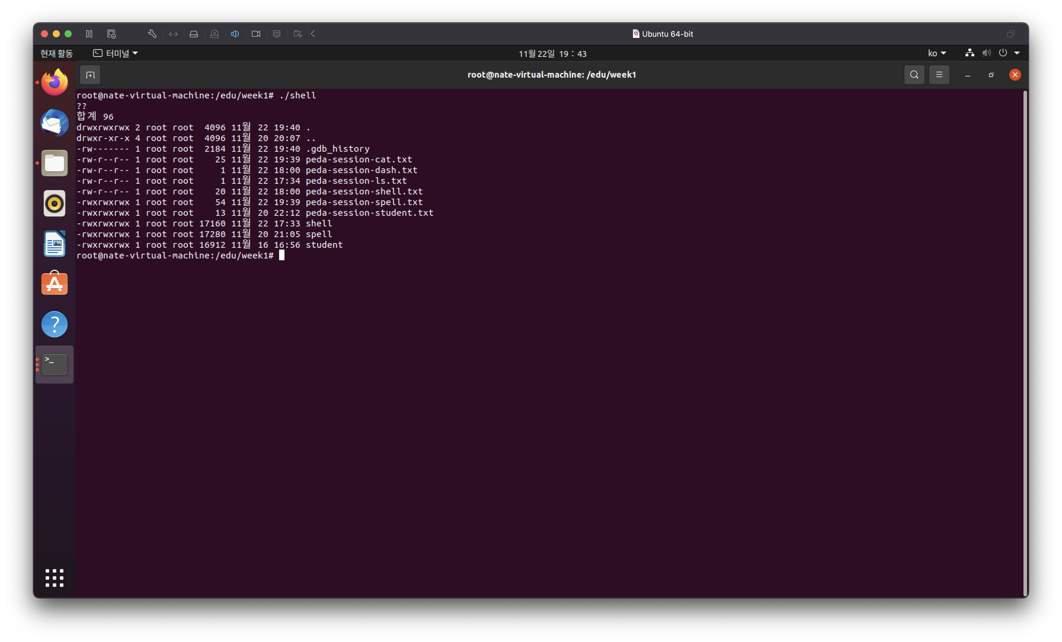 shell νλ‘κ·Έλ¨μ μ΄λ€ λ¬Έμμ΄μ μ λ ₯νλ©΄ μμ ls -al λͺ λ Ήκ³Ό κ°μ μλ΅μ μΆλ ₯νλ νλ‘κ·Έλ¨μ΄λ€. ν΄λΉ νμΌμ΄ μλ λλ ν 리μ μλ΅κ³Ό μΌμΉνκΈ° λλ¬Έμ λΆλͺ νλ‘κ·Έλ¨ μμμ ls -al λͺ λ Ήμ μ€ννλ μμ€ν ν¨μλ₯Ό νΈμΆν κ²μμ μ μΆν μ μλ€.