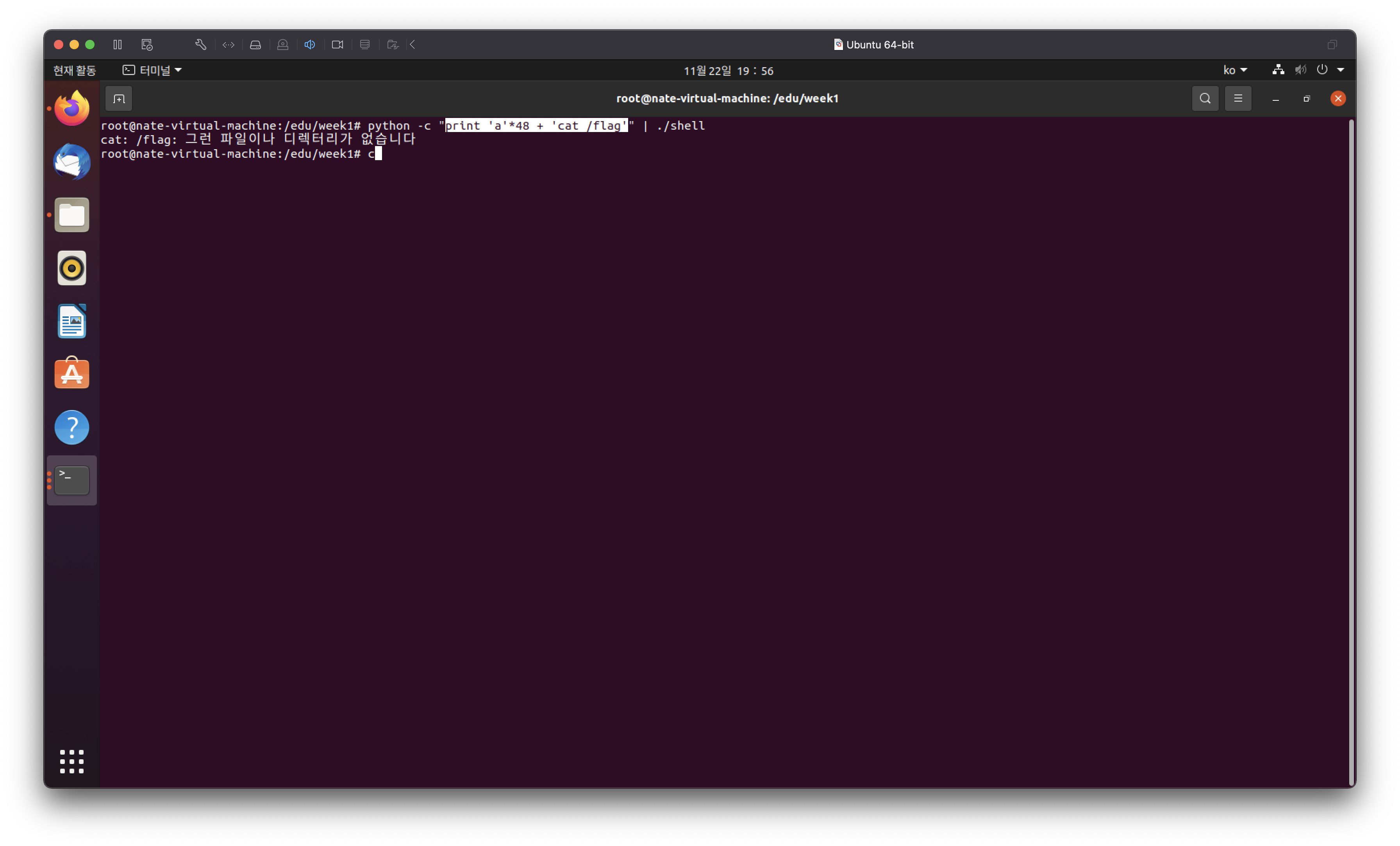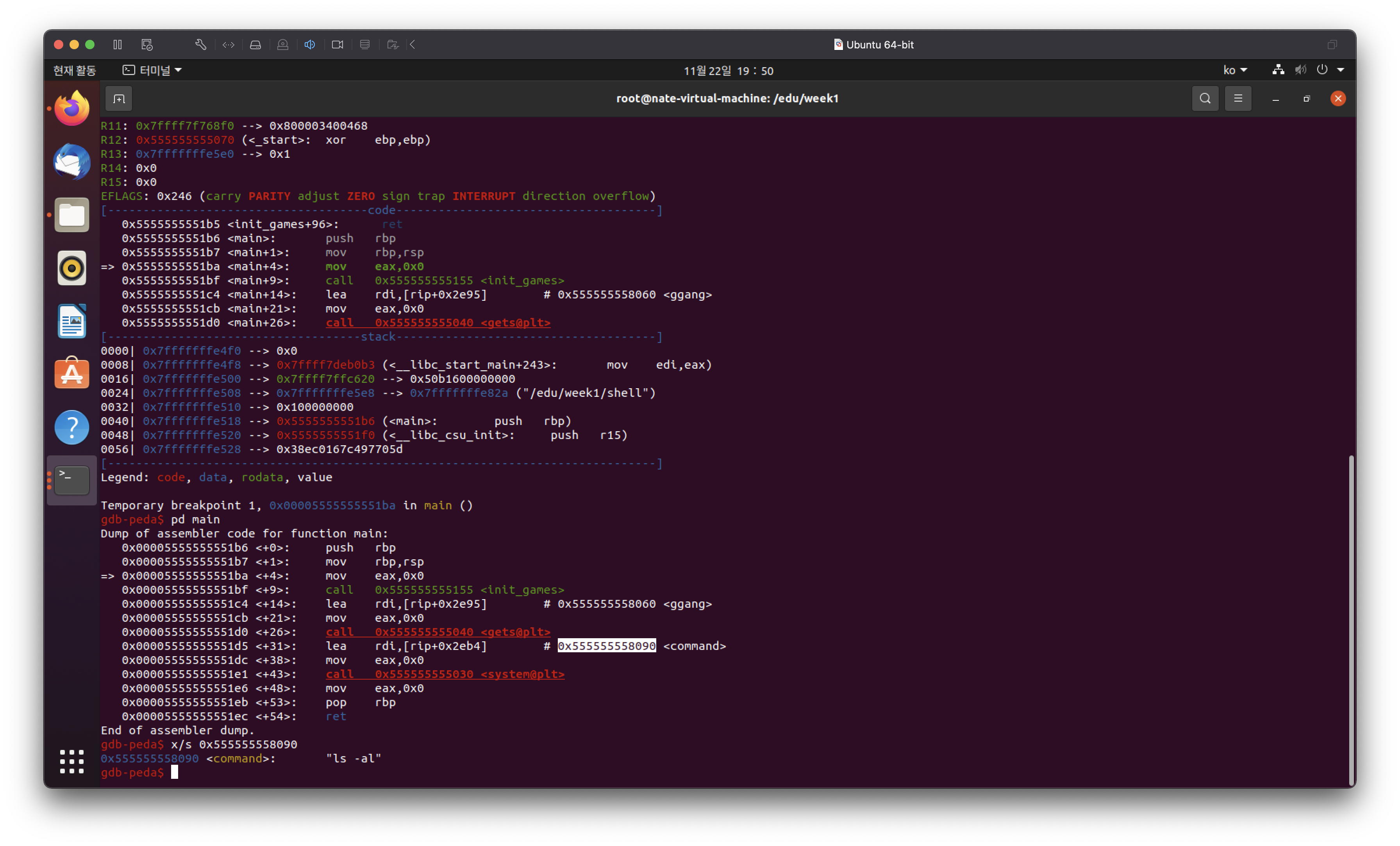 μ΄ νλ‘κ·Έλ¨μμ μ¬μ©λ gets ν¨μλ μ€λ²νλ‘μ°λ₯Ό λ΄μ μ΄λ€ νμμΌλ‘ μ λ ₯λλ λͺ λ Ήμ΄λ₯Ό μμ ν¨μ΄ λͺ©μ μΌ κ²μ΄λ€. λ°λΌμ κΈ°μ‘΄μ μ λ ₯λμ΄μμ ls -al λͺ λ Ήμ΄μ μμΉλ₯Ό λ¨Όμ νμΈν΄λ³΄κΈ°λ‘ κ³ννμλ€.