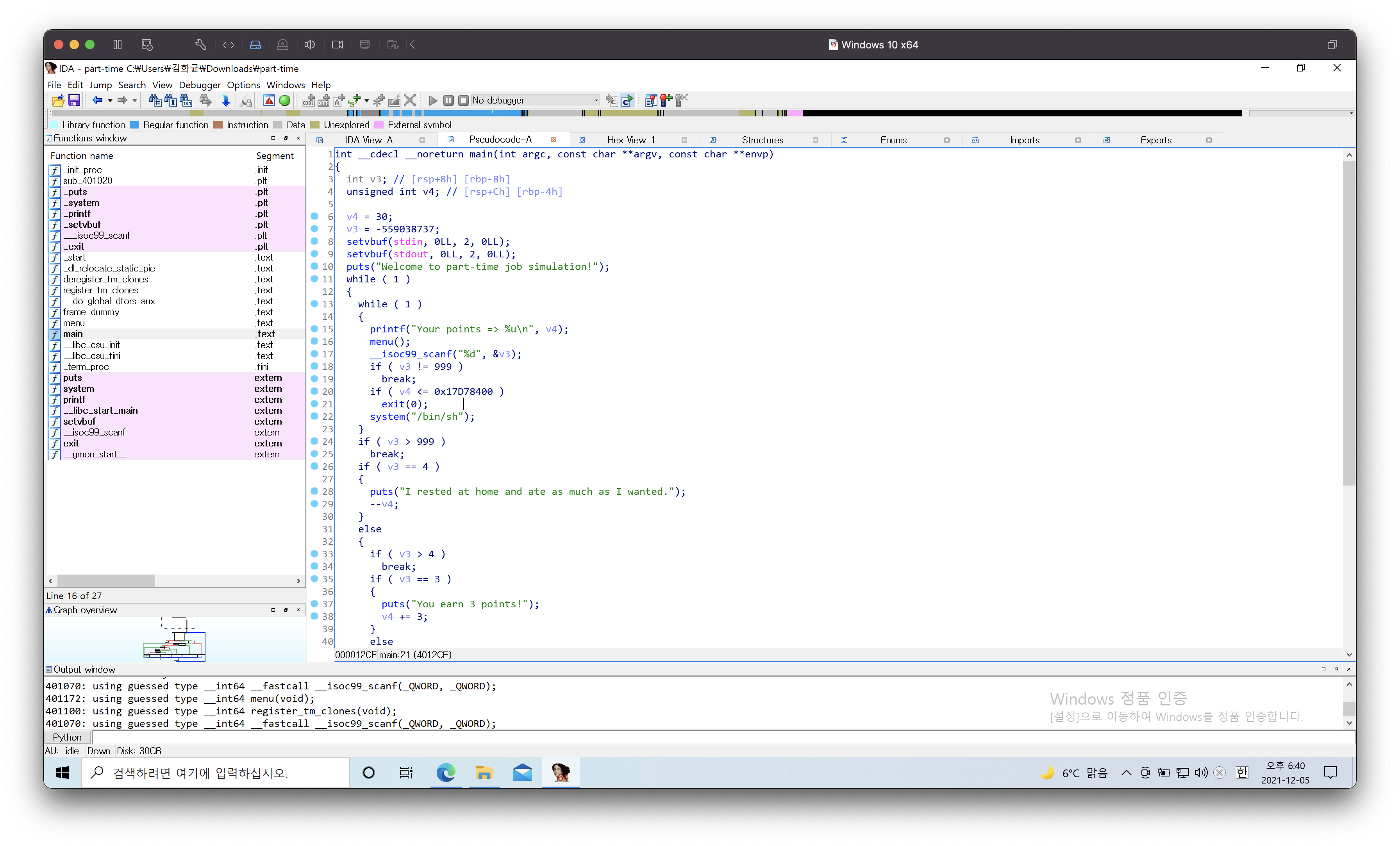IDA๋ฅผ ํตํด ๋ณธ๋ C์ฝ๋๋ก ํ์ธํ ๊ฒฐ๊ณผ v3๊ณผ v4์ ๋ฐ์ดํฐ๋ฅผ ์กฐ์ํ์ฌ ํ๋ก๊ทธ๋จ์ด ๊ตฌ๋๋๋ฉฐ, ์ ๋ ฅ๋ฐ์ ๊ฐ์ด ํน์ while๋ฌธ์ ํตํด systemํจ์๋ฅผ ์คํํ ์ ์์์ ์์๋ค. ๋ฐ๋ผ์ ์๋ ๋ฐฉ๋ฒ์ ํตํด flag๋ฅผ ํ๋ํ ์ ์์์ ์ ์ ์๋ค.