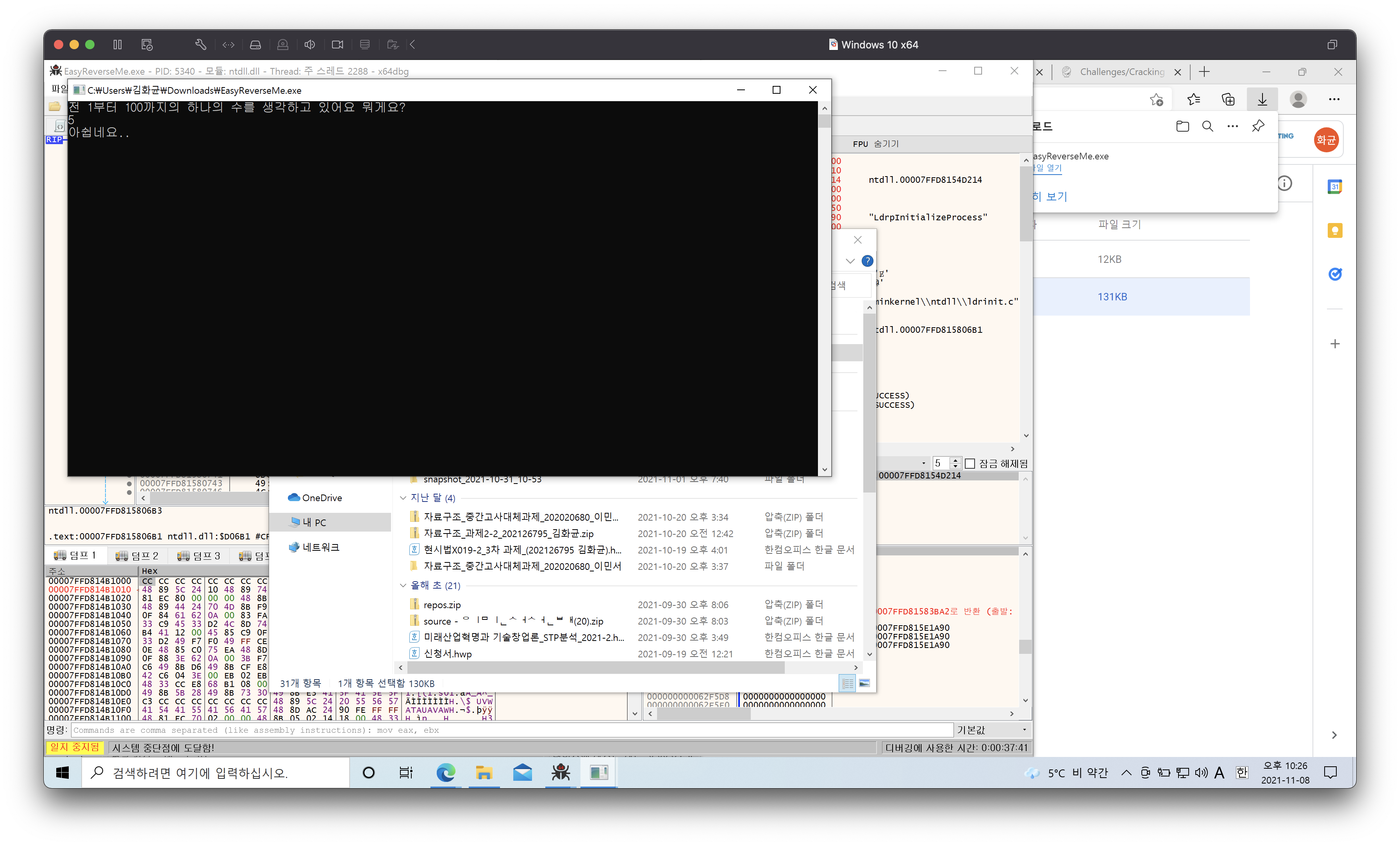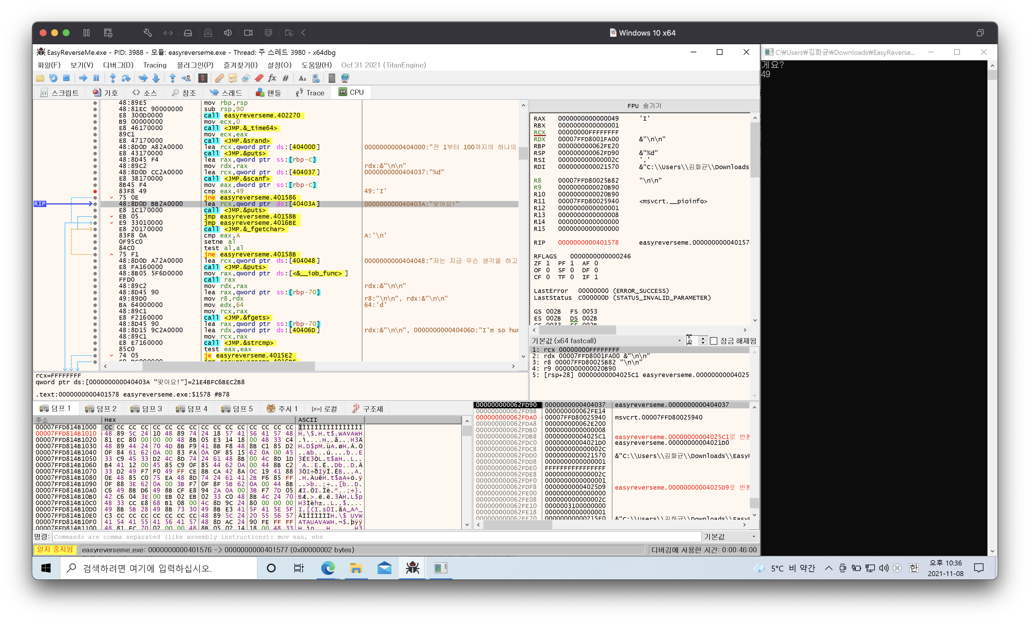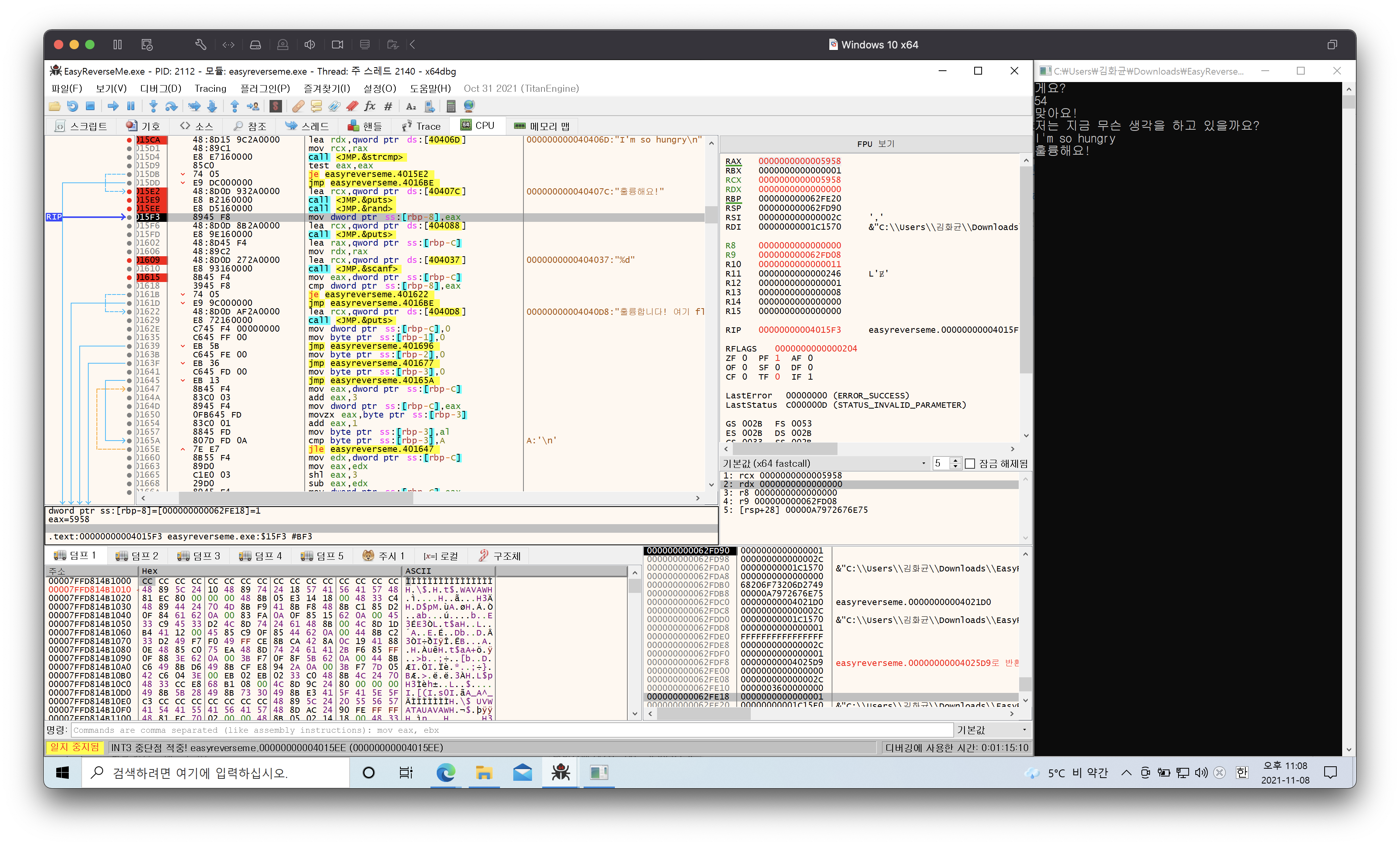 EasyReverseMe.exe ํ์ผ์ x64dbg๋ก ์ฐ ํ๋ฉด์ด๋ค.